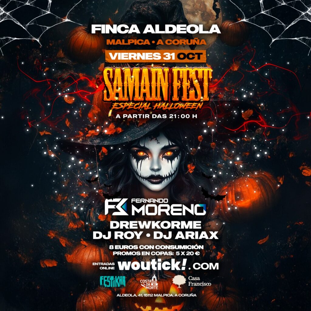 El Samaín Fest de Aldeola es una fiesta de Halloween con raíces en la tradición celta del Samaín. Se celebra en la Finca Aldeola (Malpica, Galicia) y ofrece una noche de ambiente terrorífico y divertido, con música, disfraces, decoración de calabazas y espectáculos para disfrutar del 31 de octubre de una forma única. 🎃🌕